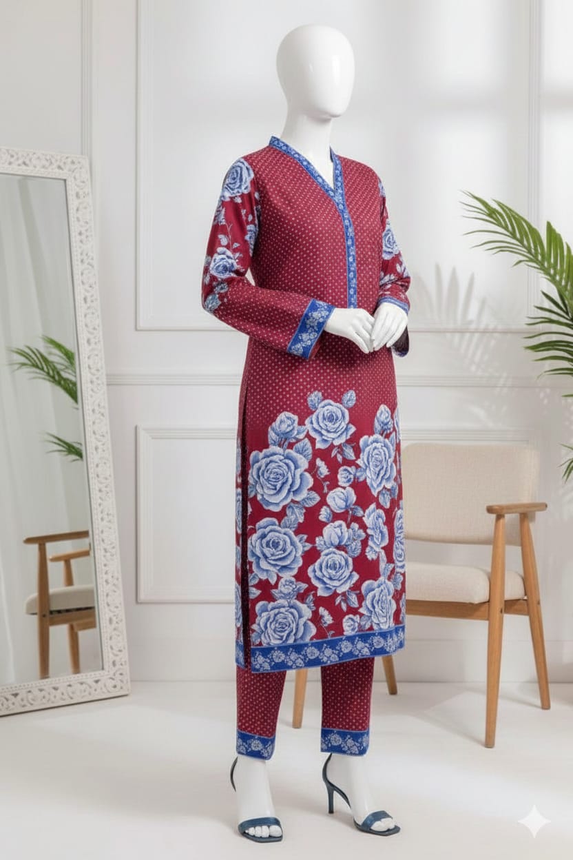 Imported crepe digital 2-piece suit with a stylish long shirt, matching plazo. Made from soft imported crepe fabric, offering a graceful fall and comfortable wear. Ideal for casual and semi-formal occasions.