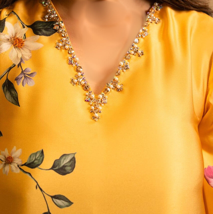 Imported crepe digital 2-piece suit with a stylish long shirt, matching plazo. Made from soft imported crepe fabric, offering a graceful fall and comfortable wear. Ideal for casual and semi-formal occasions.